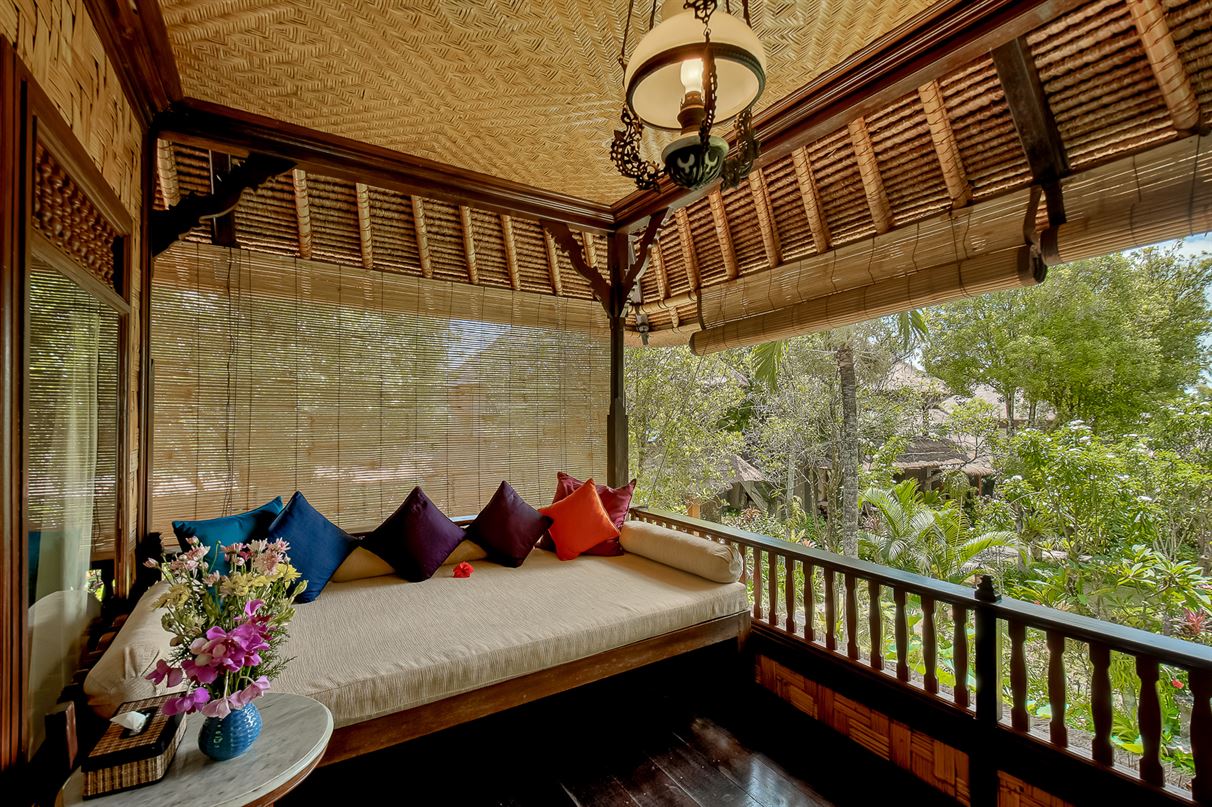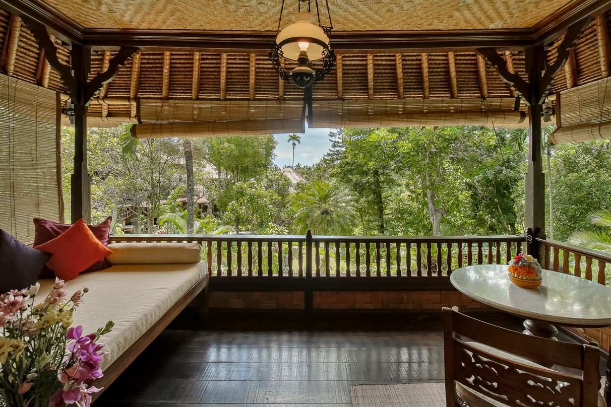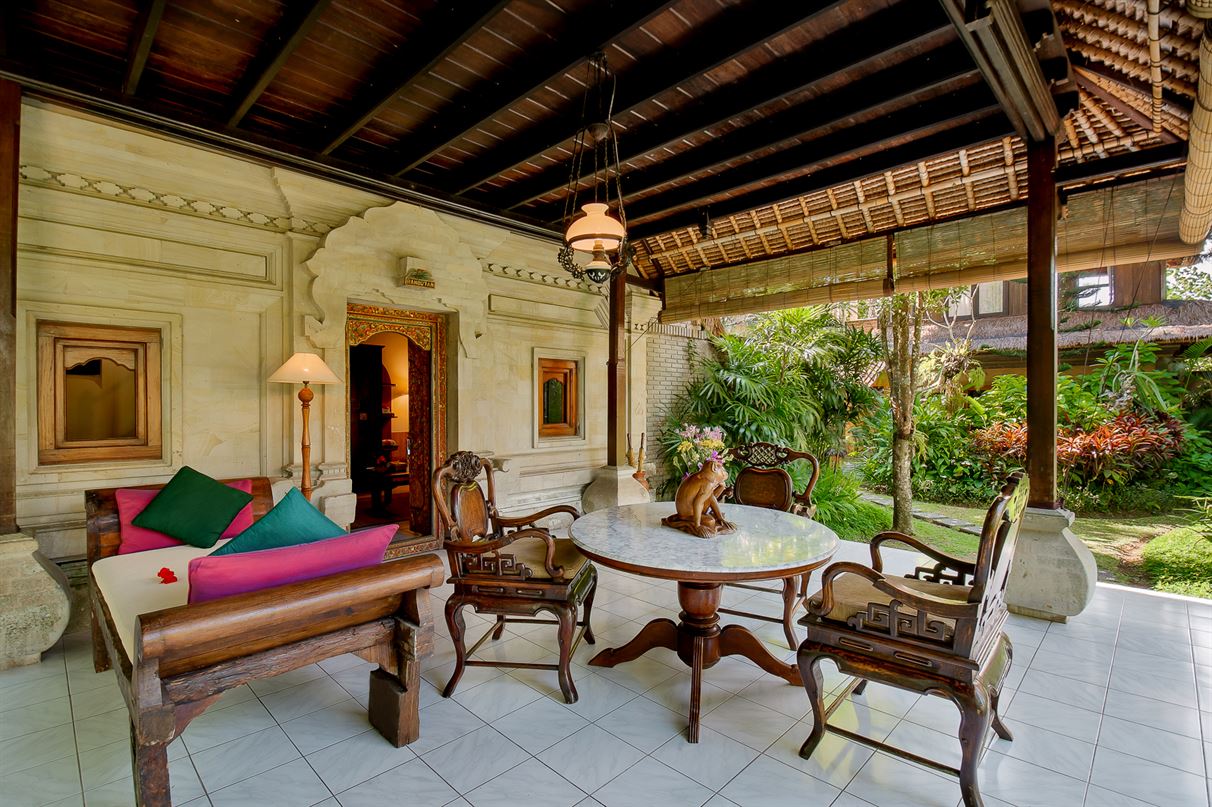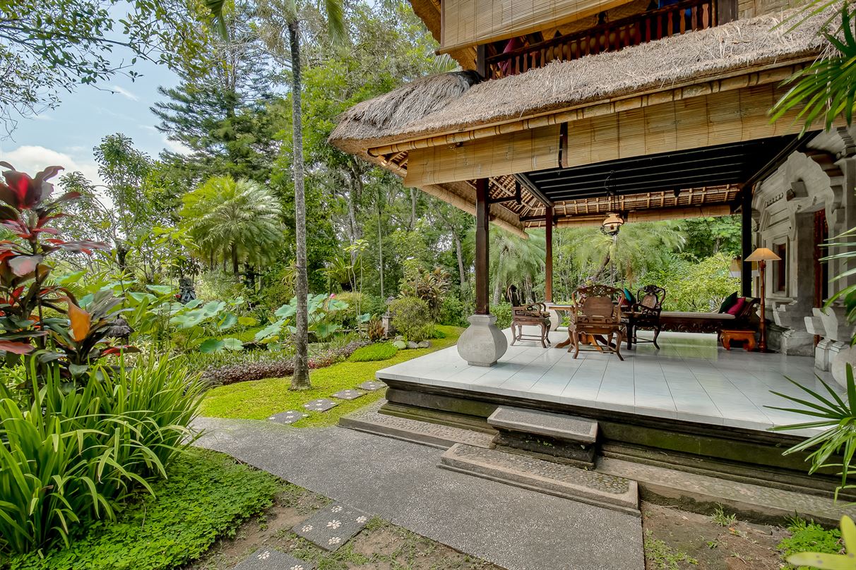 A two-level traditional Balinese bungalow enjoying garden and Monkey Forest views.