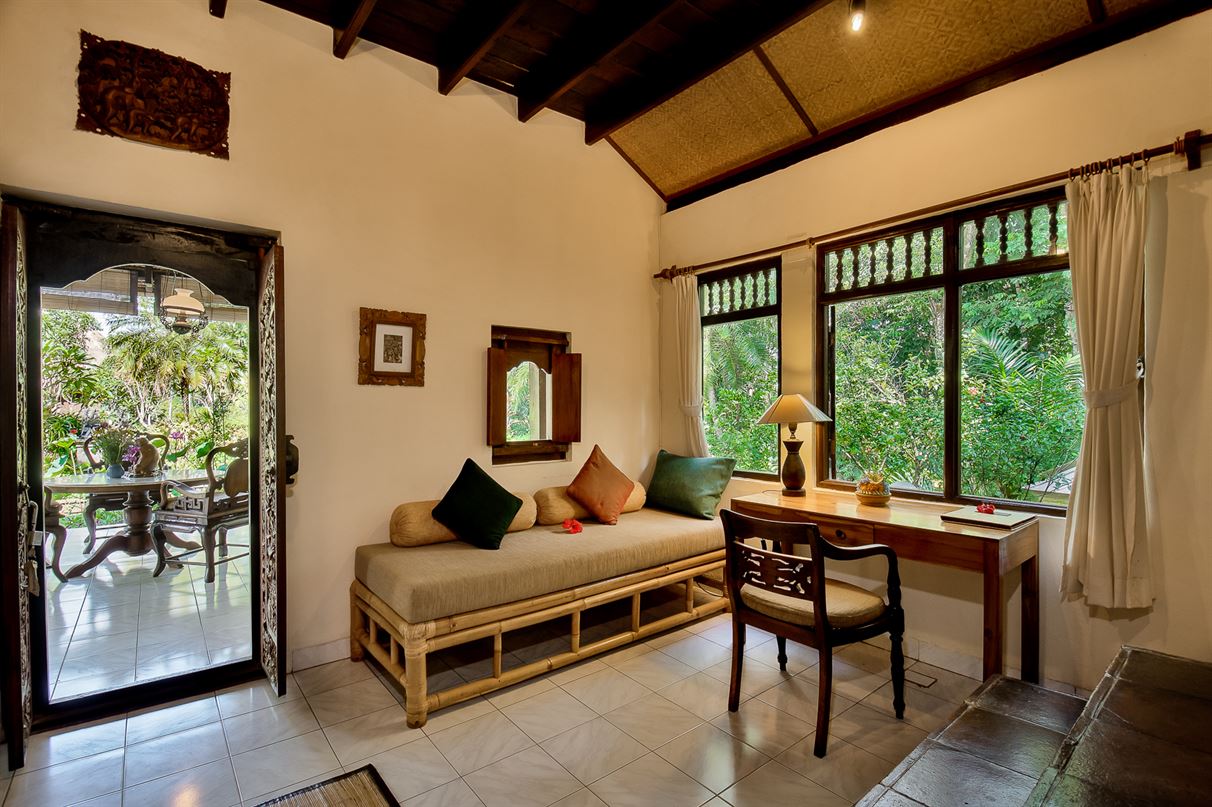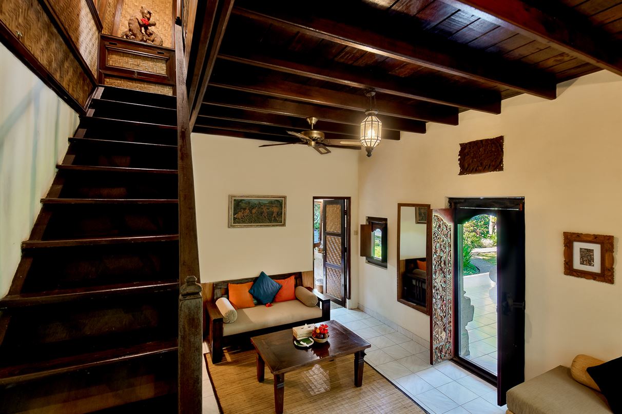 The upstairs has a master bedroom with Queen size bed, and a large outdoor veranda with a day bed. The lower level has a living space with a single sofa bed- ideal for family or friends sharing. The upstairs bedroom has air-conditioning as well as ceiling fan. The lower level has ceiling fan only. The bathroom is on the lower level and has a bathtub and a separate shower amidst Bapak Mangku's stone carvings. A spacious lower level veranda allows for relaxed outdoor living.