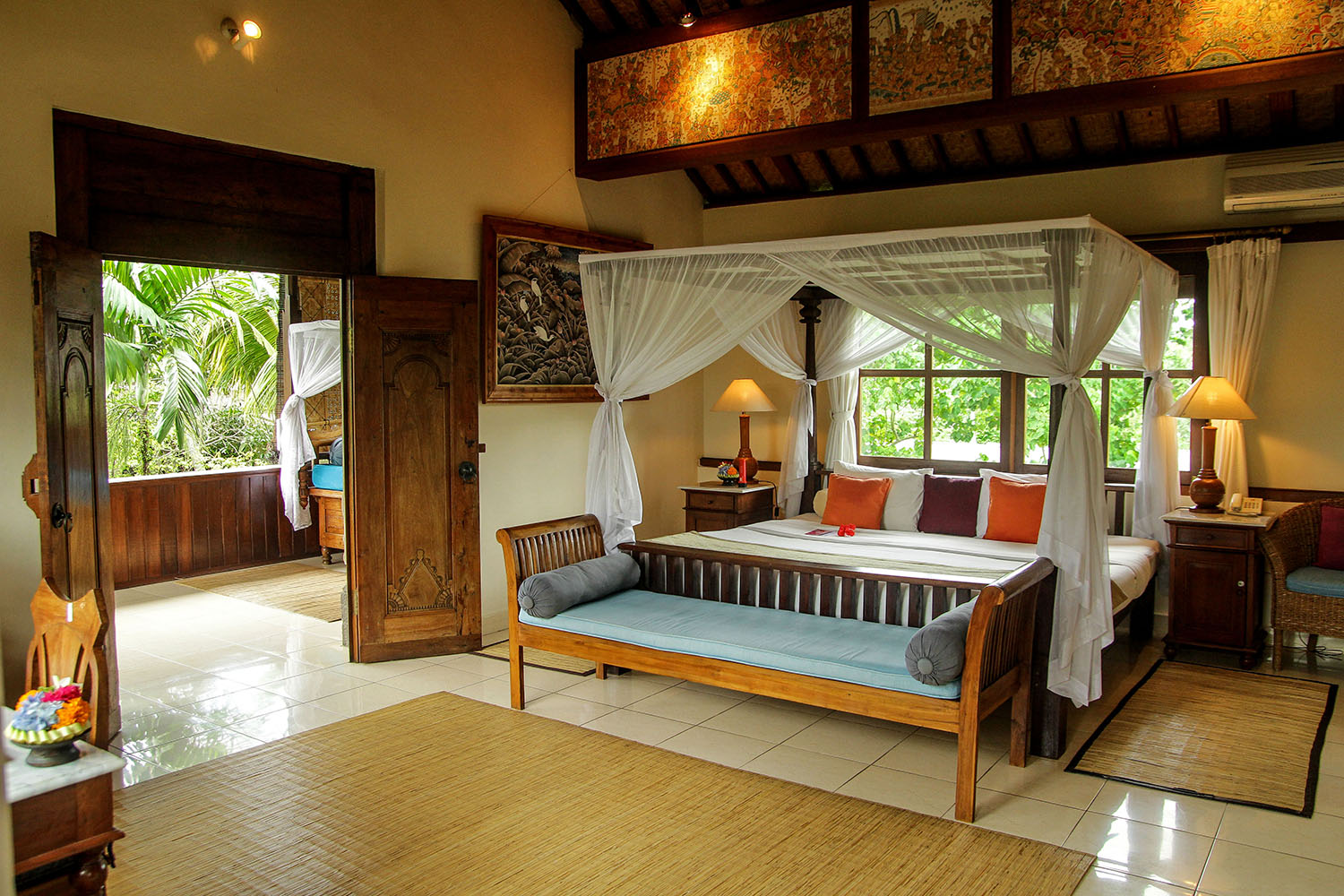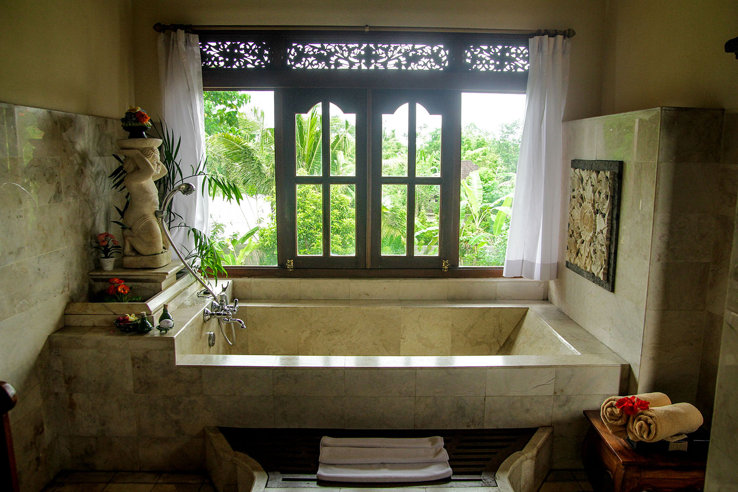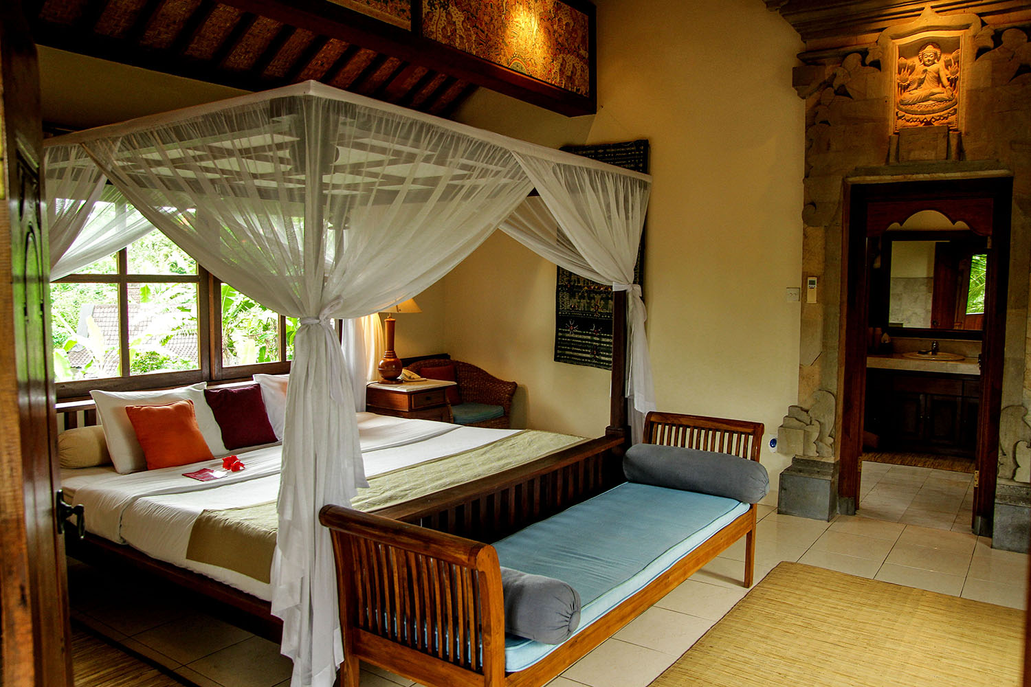 Dewi is one of two Deluxe Garden Rooms situated in one house with separate entrances. Each room is beautifully appointed in its own style embracing traditional Balinese architecture graced with stone and wood carvings by Bapak and local artisan friends. Bedrooms have both air-conditioning and ceiling fan. The bathroom has a bathtub with a shower. Meals may be taken in the privacy of your room or in the common lounge. A short walk brings you to the main pool and Alam Shanti Spa.