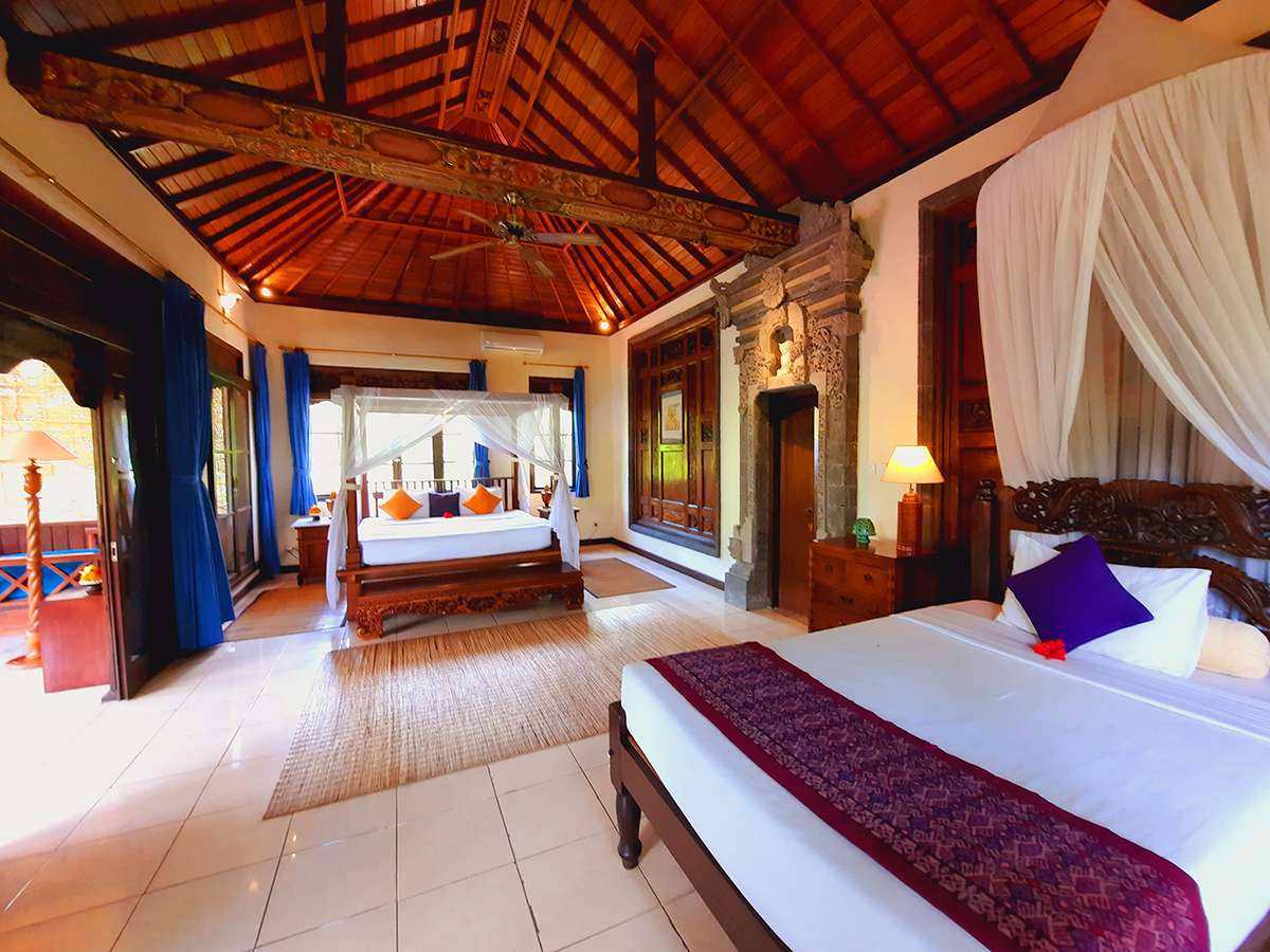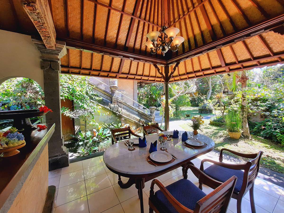 Looking out to the lush gardens, feel serene and at home. The bedroom has one Queen bed and a single bed, air-conditioning as well as ceiling fan. The bathroom has a bathtub and a separate shower, Indus is ideal for couples, singles or friends and family sharing. A gazebo with a kitchen and dining space is available in the garden for private or shared use. You may also enjoy meals in the privacy of your room. Our staff are always available to make your stay comfortable and memorable.