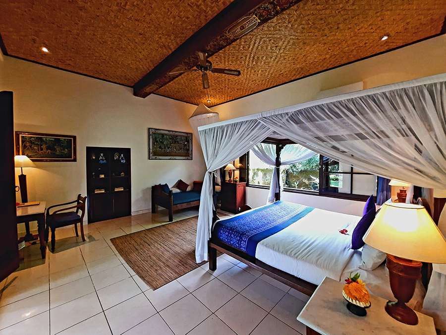 Looking out to lush gardens, feel serene and at home. The bedroom with one Queen bed and a single bed has both air-conditioning and ceiling fan. The bathroom has a bathtub and separate shower. A gazebo with a kitchen and dining space is available for private or shared use. Meals may also be taken in the privacy of your room. Our staff are always available to make your stay comfortable and memorable. A short walk brings you to the common pool and Alam Shanti Spa.