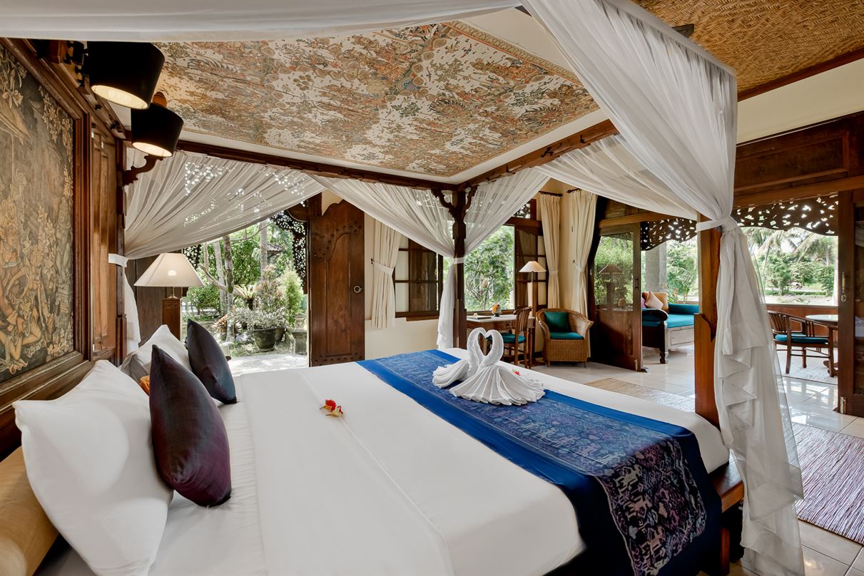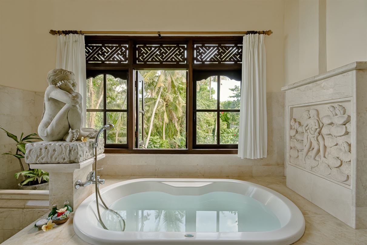 Amidst lush gardens, feel at home in this luxurious space. Facilities include a writing desk, dressing room, mini-fridge and coffee/tea maker. A spacious garden bathroom includes a bathtub and shower. Ideal for couples, singles, friends or families enjoying a luxurious Balinese experience. Enjoy relax time at the private pool shared with the upper level Gangga Suite.