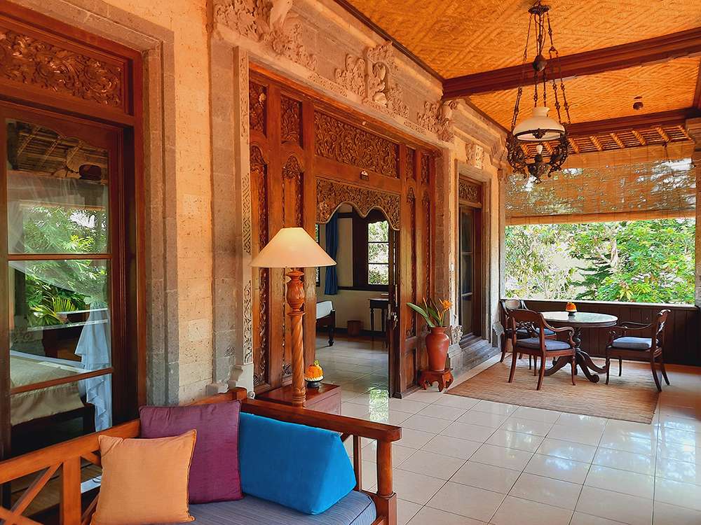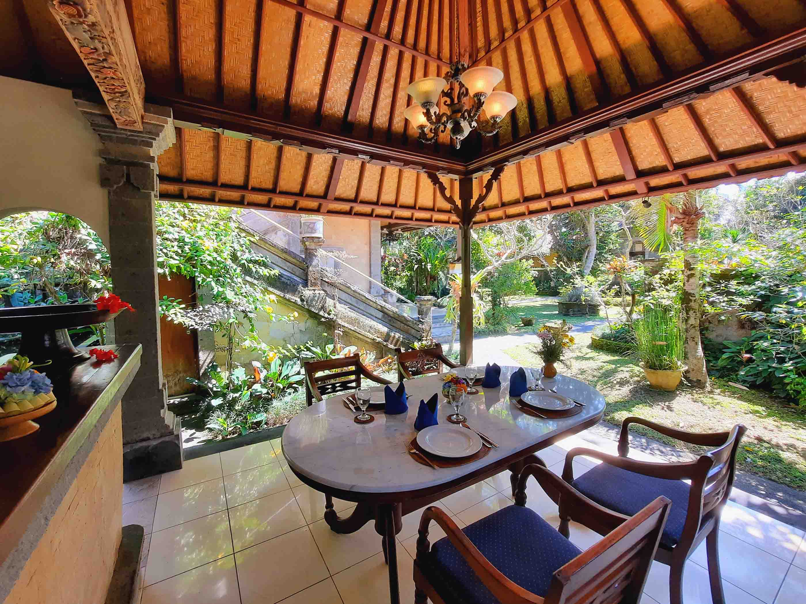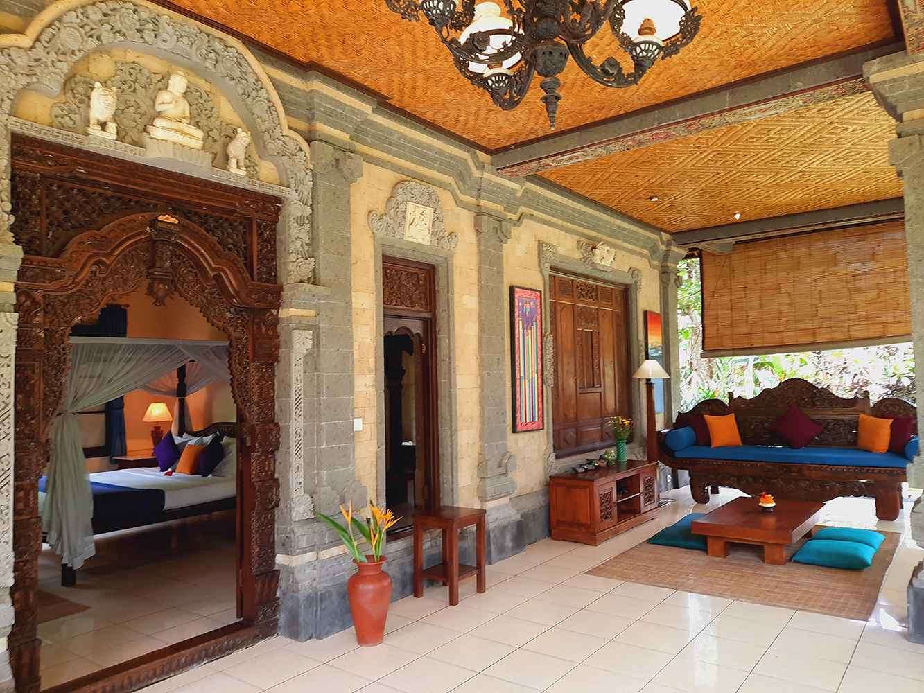 Two Grand Deluxe Garden Rooms are situated in one house within a peaceful compound at Alam Shanti. Each room has a private entrance but the compound can also be a lovely space to share with families or friends. A gazebo with a kitchen and dining space is available for private or shared use. Meals may also be taken in the privacy of your room. Each room is beautifully appointed in its own style embracing traditional Balinese architecture graced with stone and wood carvings by Bapak and local artisan friends. Bedrooms have both air-conditioning and ceiling fan. Bathrooms feature a bathtub and a separate shower.