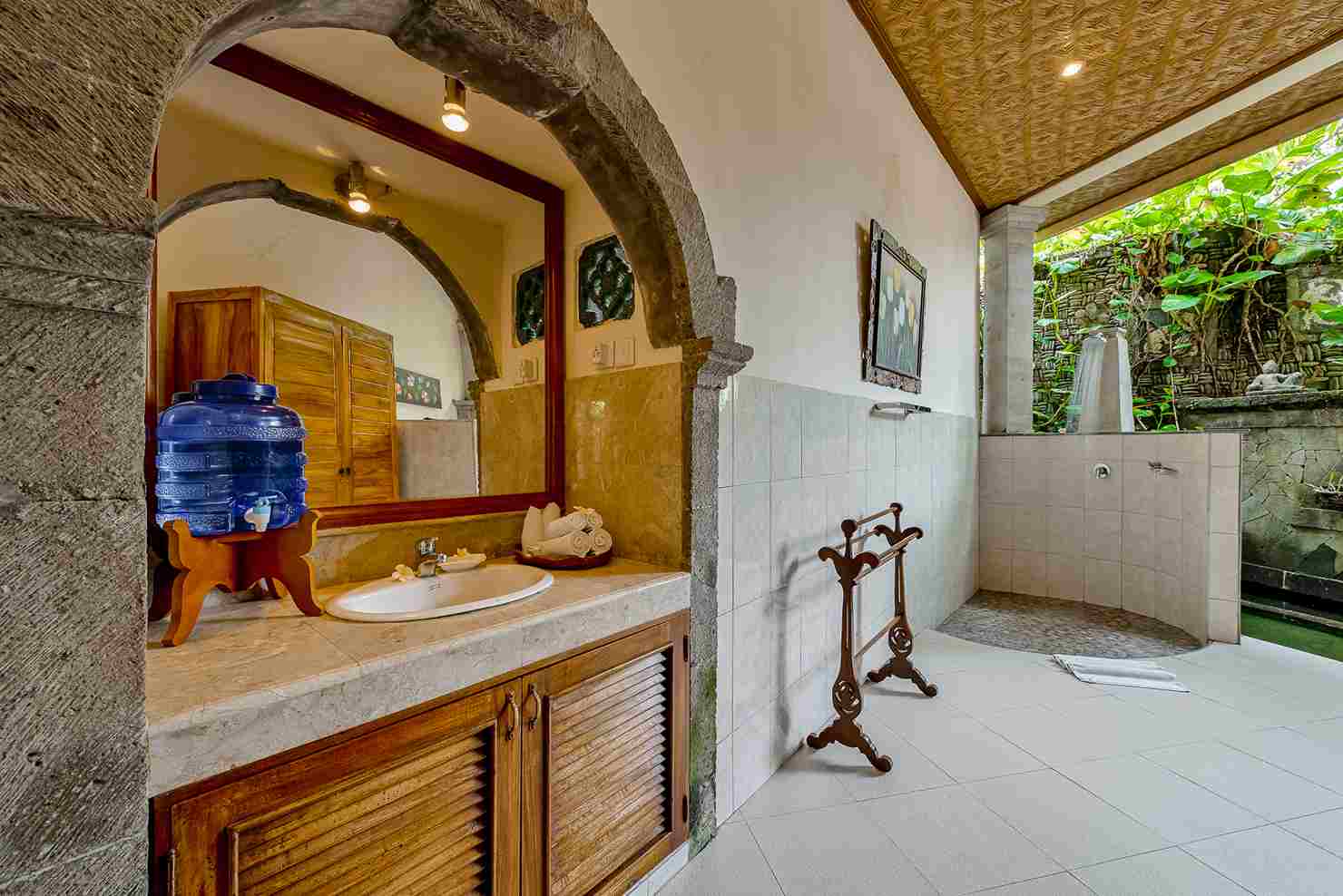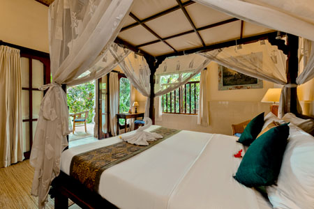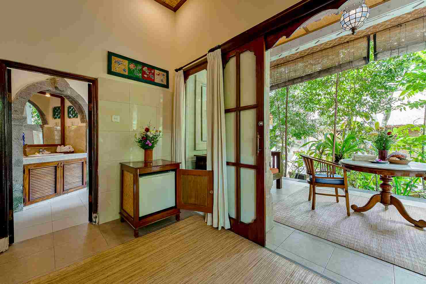The Tea House is a cozy lower level room- 15 steps down from the reception area and another 15 steps down to the common pool. A lovely veranda space invites you to relax amidst the serene garden. The bedroom has air-conditioning as well as ceiling fan. A luxurious open-air bathroom has a bathtub and a separate shower. The Tea House has a writing desk and a mini fridge.